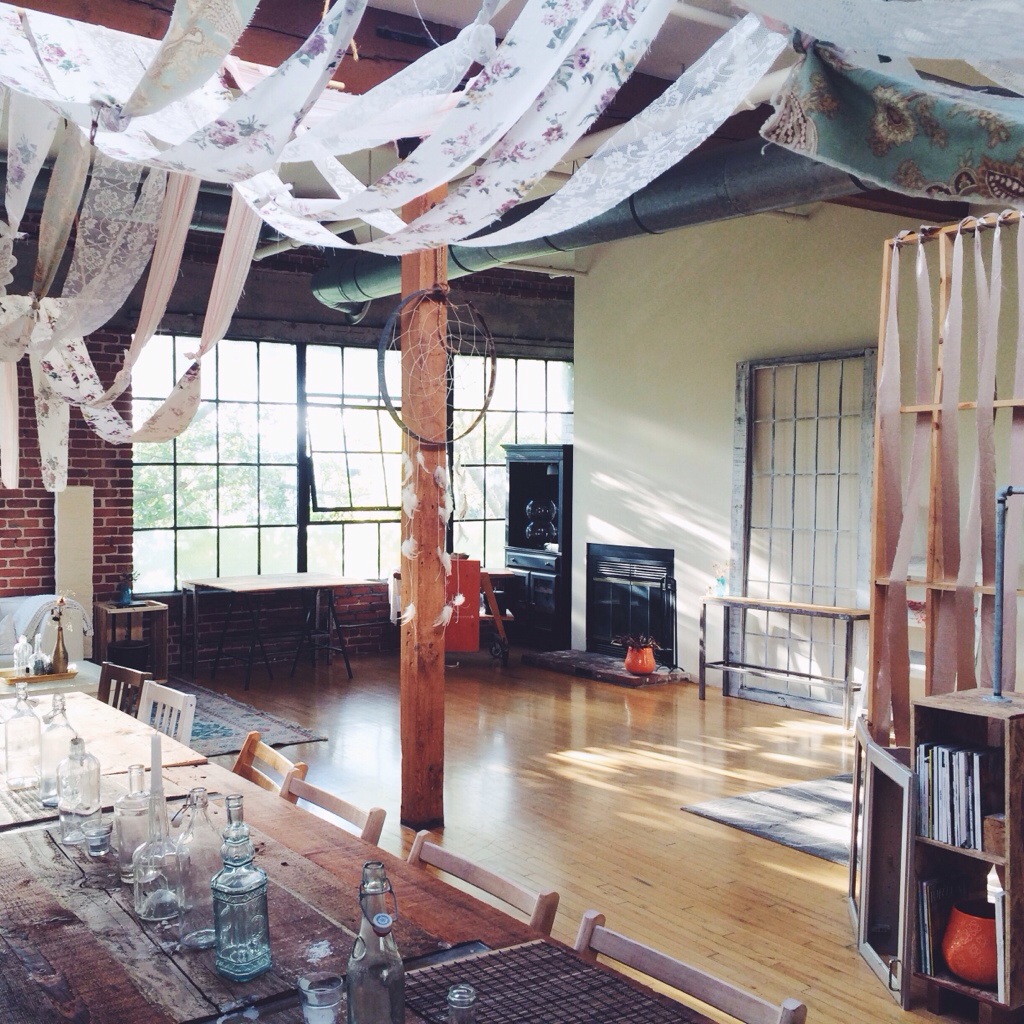 My home for the month of April was a beautiful downtown loft and the home of stylist Kara Dykert. The light in the loft was so stunning, with a giant skylight, a FIREPLACE! sunset views and trees swaying outside the industrial windows. I couldn’t wait to host a gathering in this space.