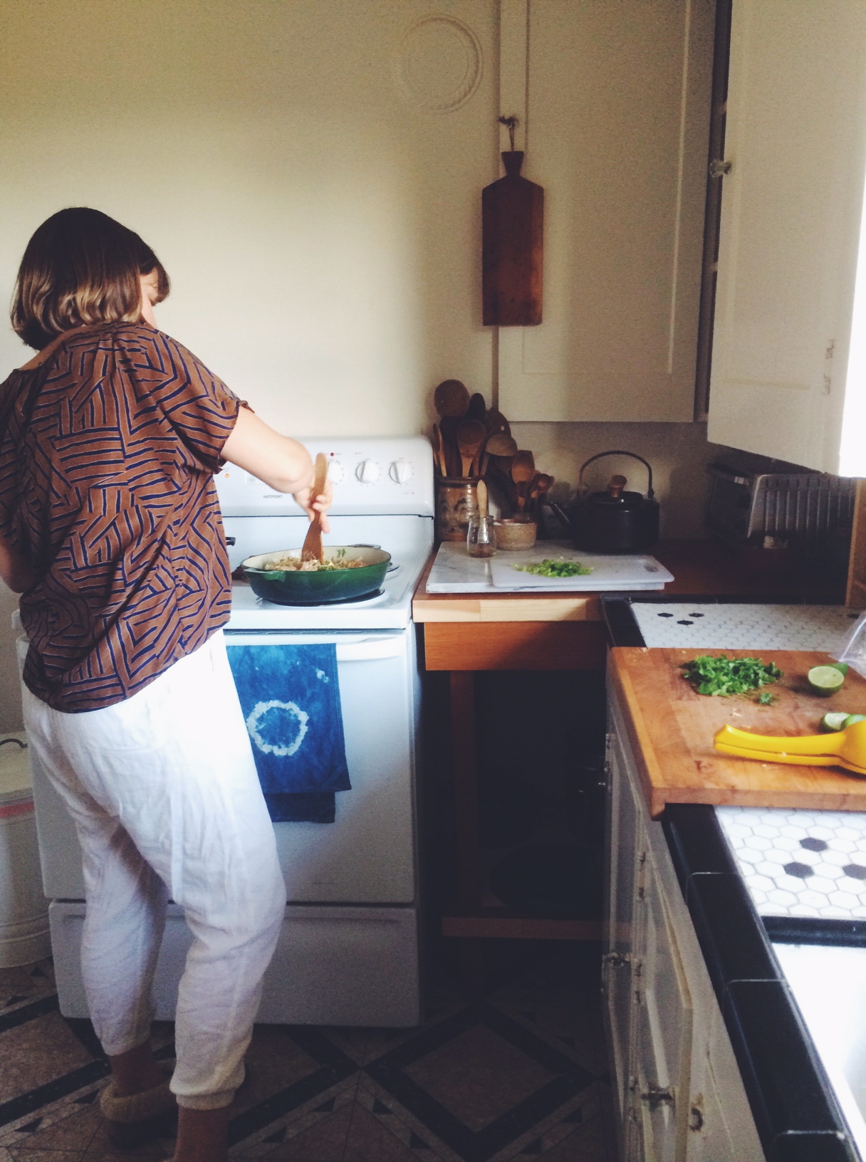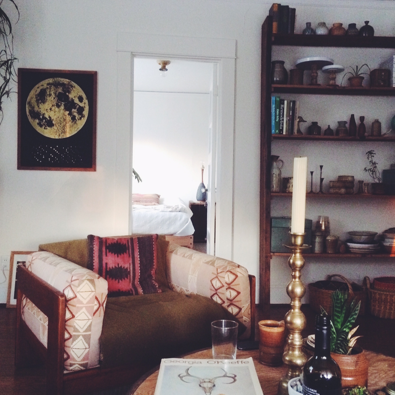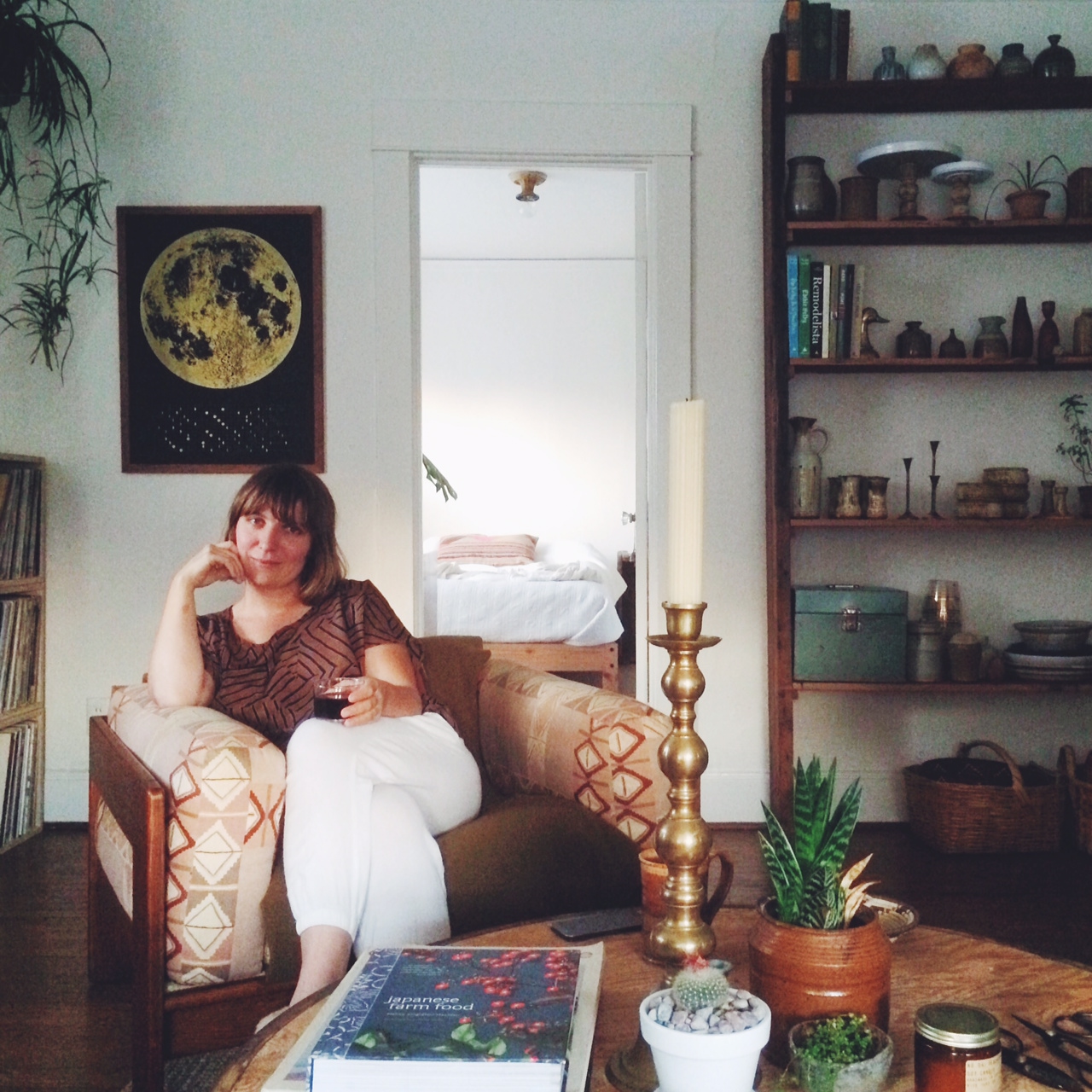 I walked over to her house, we only live a handful of blocks away, and climbed the stairs in the vintage triplex to her lovely upstairs abode. The colors in the room are muted, neutral, and cozy. Shelves and tables she handmade with her dad line the walls and are perfectly filled with just the right amount of handmade ceramics and wooden bowls. Everything is of natural fiber. I don’t think she has any plastic in her home. Just bright pops of green from her big happy plants, glimmers of brass, and carefully selected artwork.