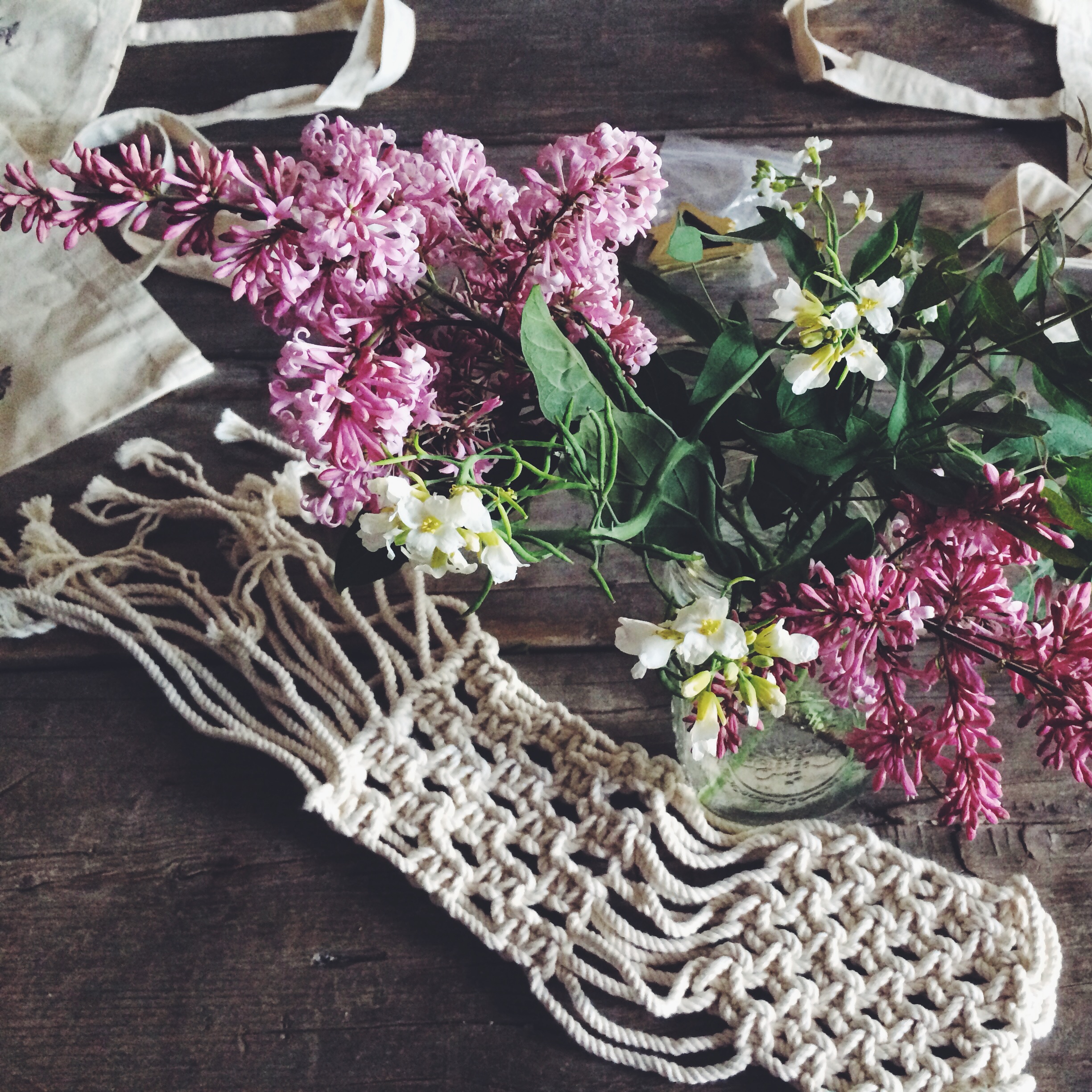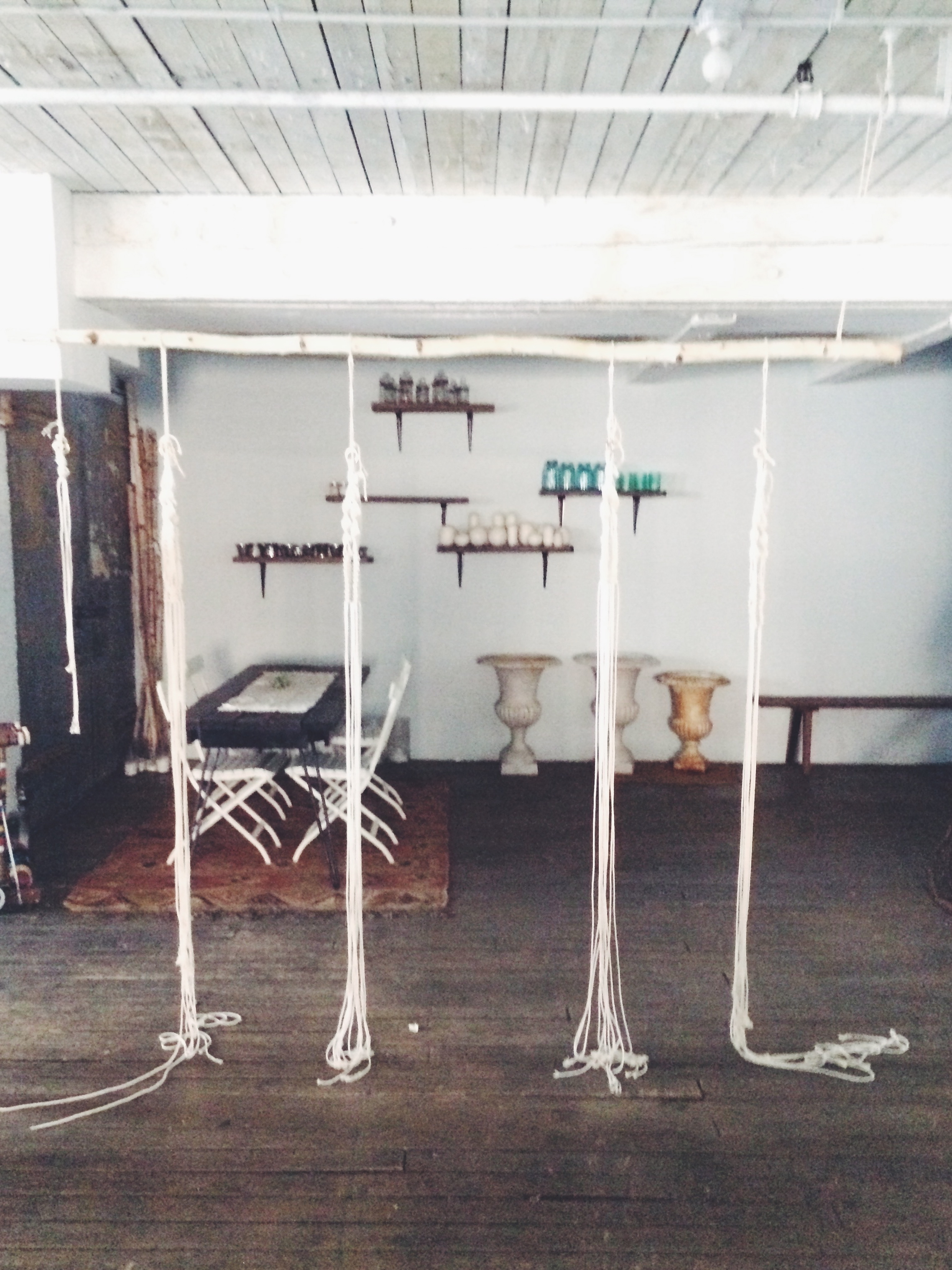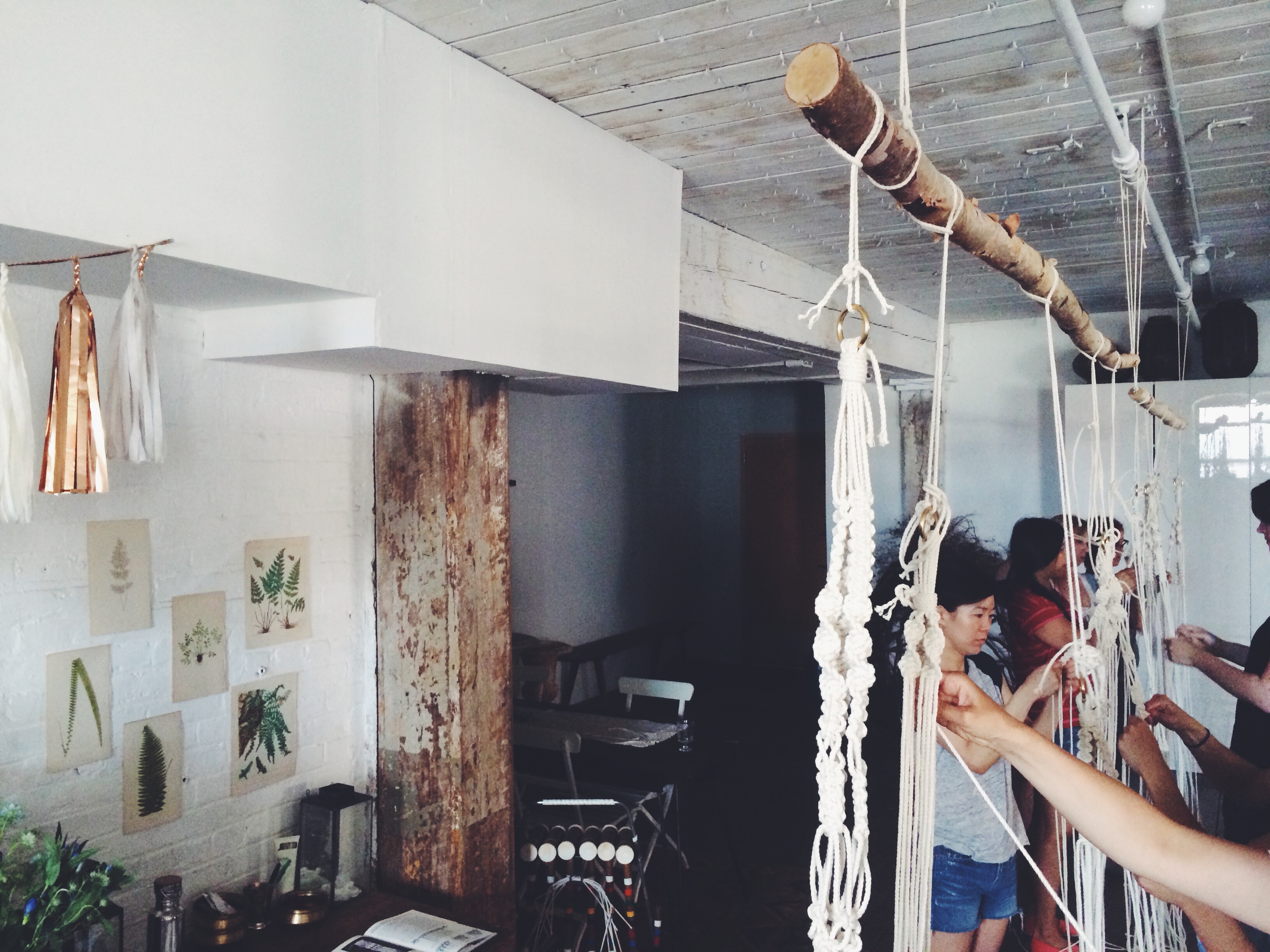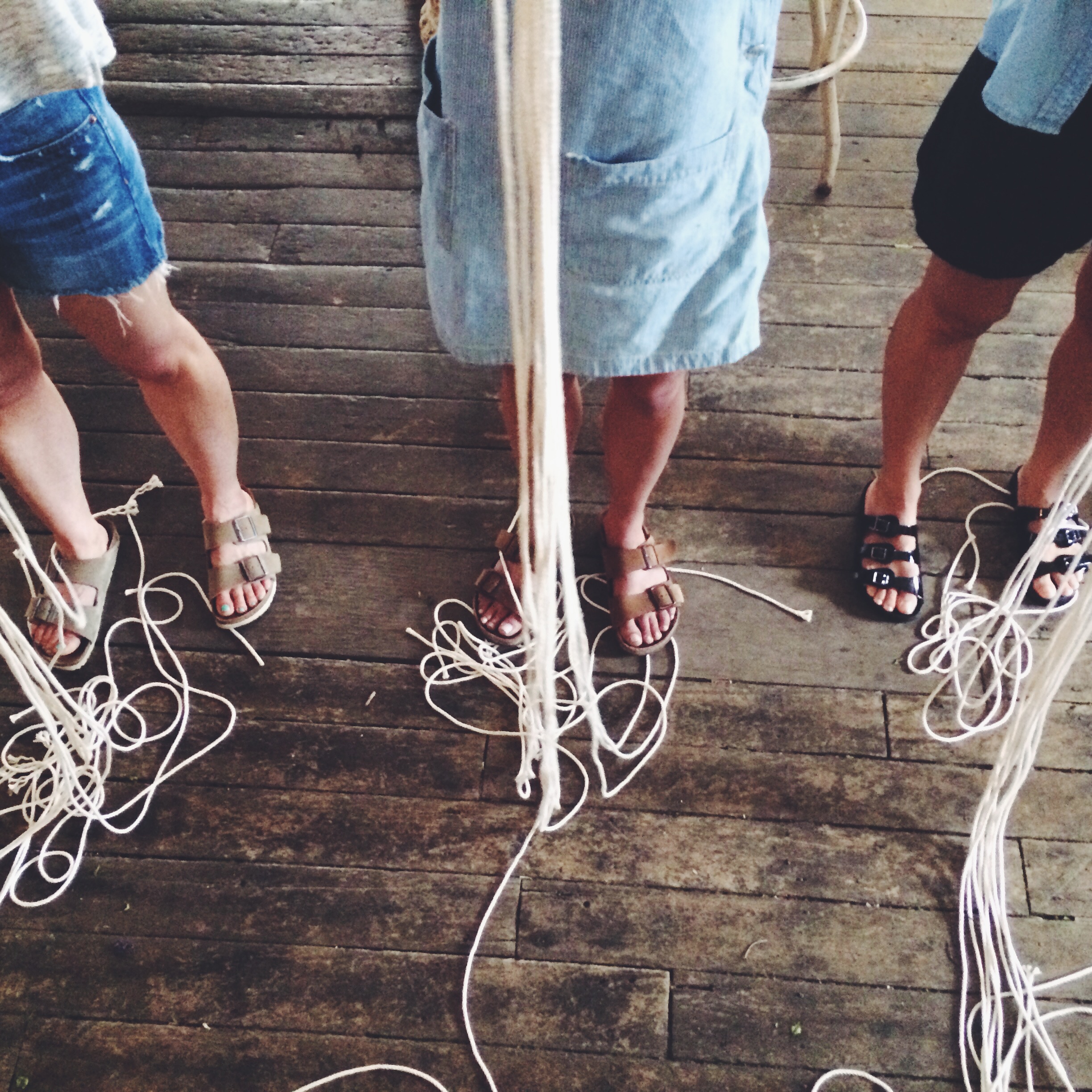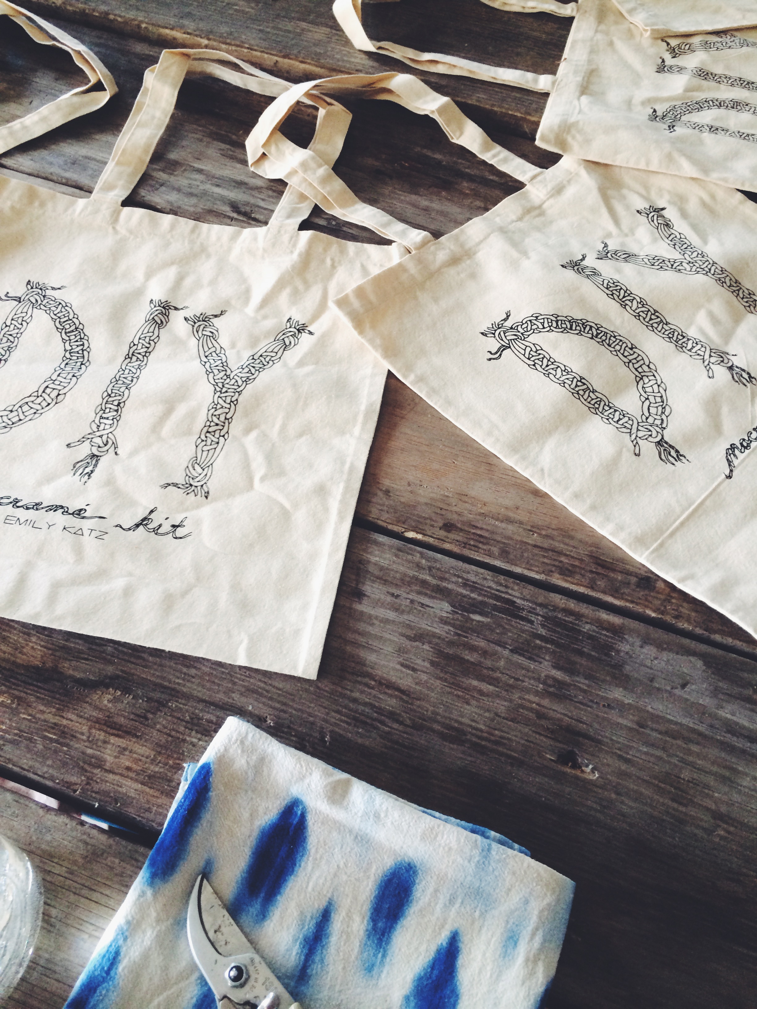 Everyone arrived right on time, and for a June afternoon, the temperature was perfect. I designed tote bags that Adam screen printed for me for everyone to take their macrame arrangements home in.