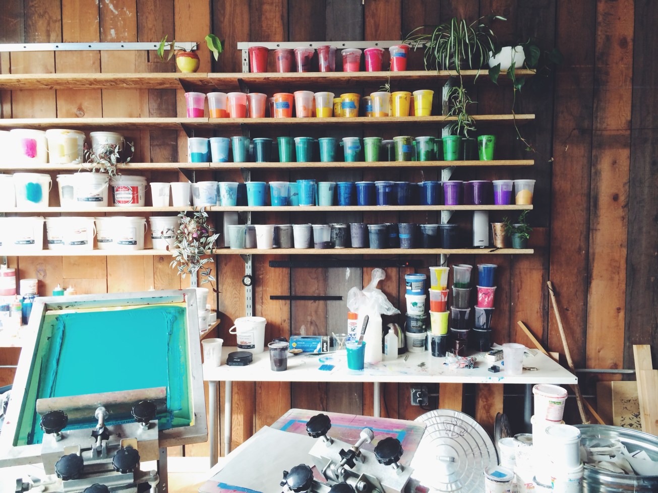 The rainbow wall of ink in Adam Porterfield’s screenprinting studio