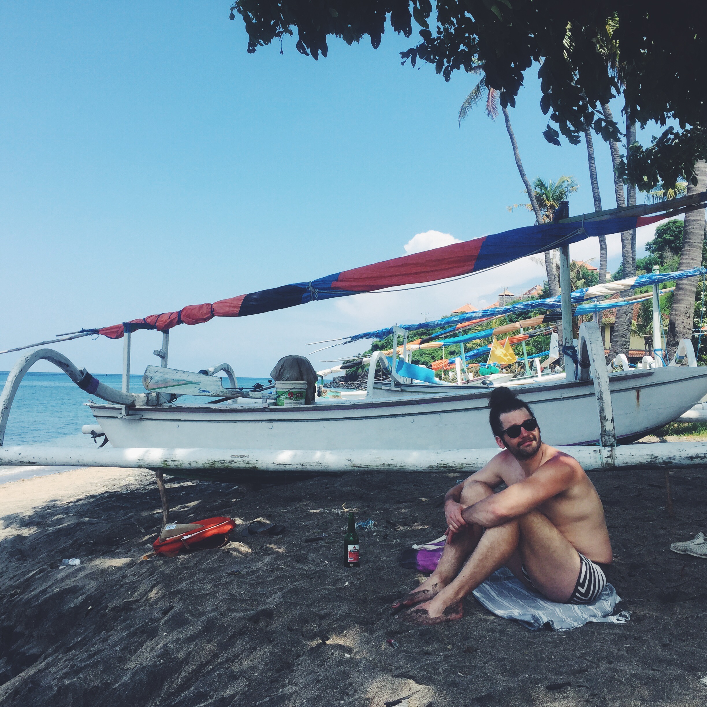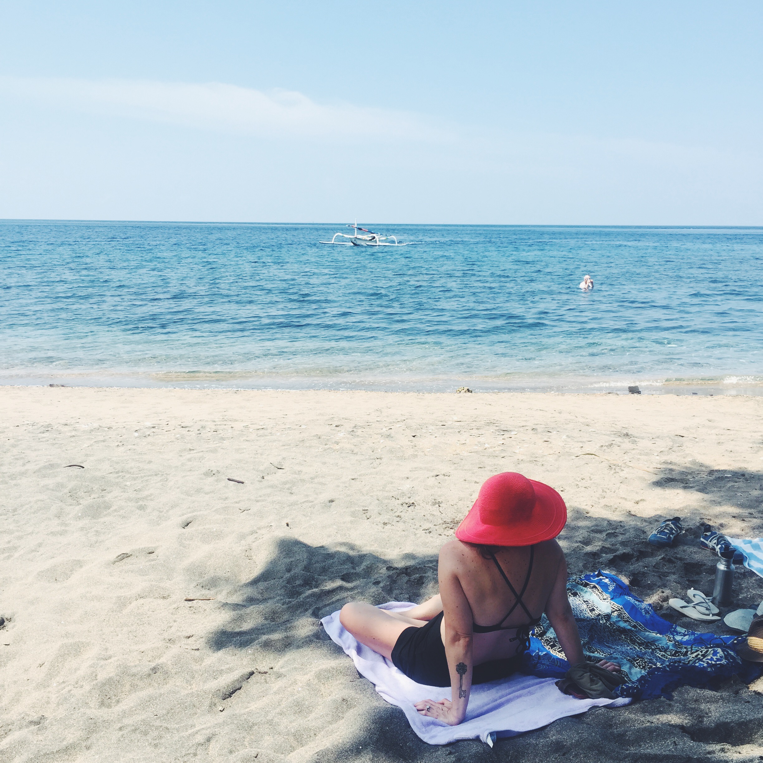 When I made the resolution over 2 years ago to get out of my comfort zone and take a trip a month, I didn’t see Bali on the horizon. But through a chance meeting over dinner 6 years ago that connected my partner Adam to our friend Rob who owns this beautiful place in Amed, Bali, our tickets were booked. I had heard stories from friends who had visited about the peacefulness of the place, the ritual, the offerings. I had heard about temples, and I had heard about hippy surfers. I had also heard about all the fresh fruit, the chickens and the local dogs. I had heard about the textiles, and the genuine smiles plastered on the faces of the local people. Also, four of our friends from Portland were going to be there, staying in the Villa owned by our other friend, and they had no idea we were coming. We found flights by doing a google search, and finding the cheapest days to fly. We ended up flying Delta Portland to Tokyo, to Singapore, to Denpasar Bali. The total travel time was 38 hours. We slept in the airport on the floor, we ate all the airplane food, we watched a million movies. (on the way home we stayed in the airport hotel in Singapore. TOTALLY WORTH IT).