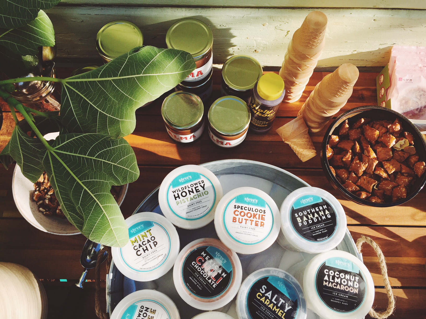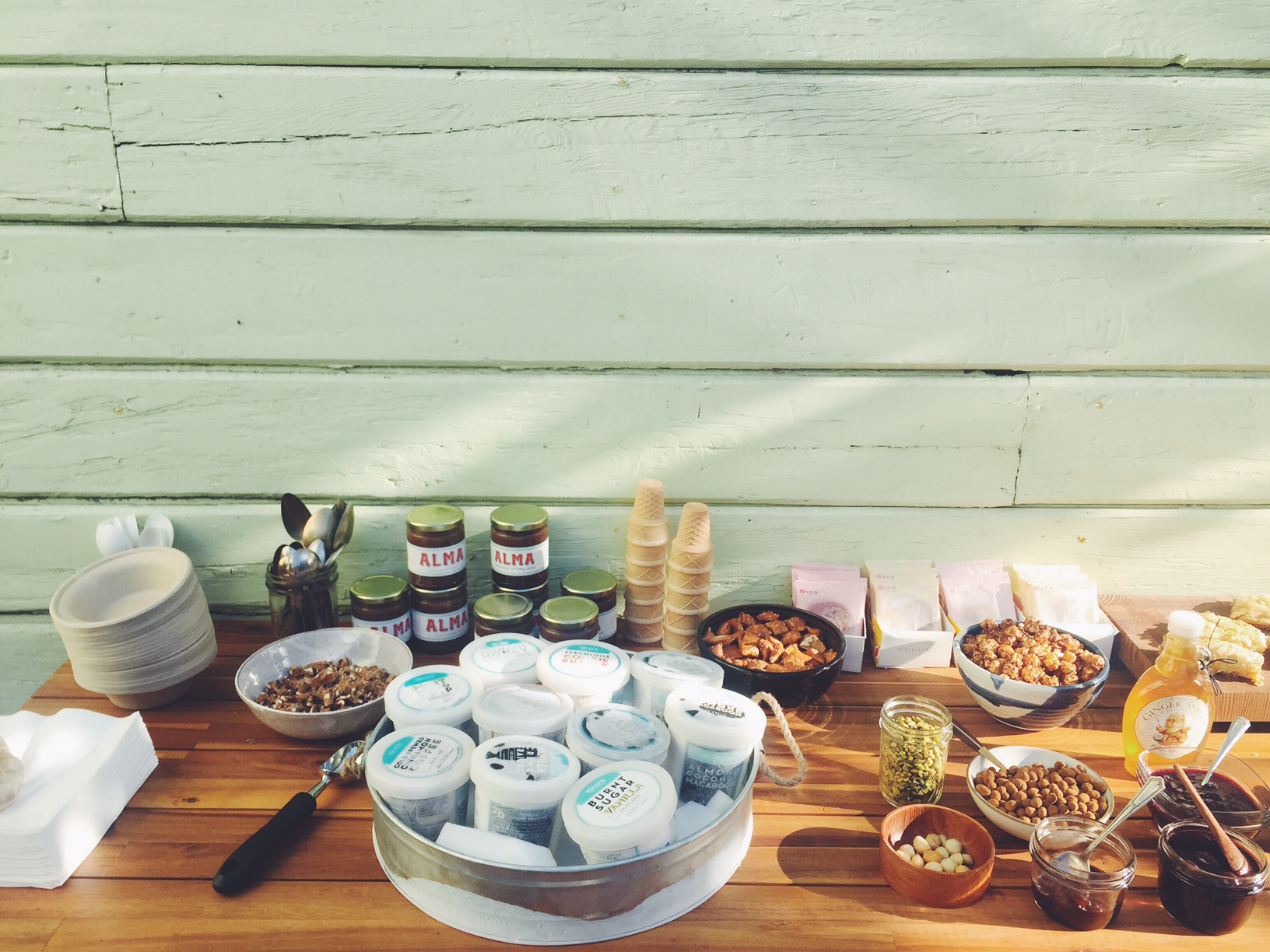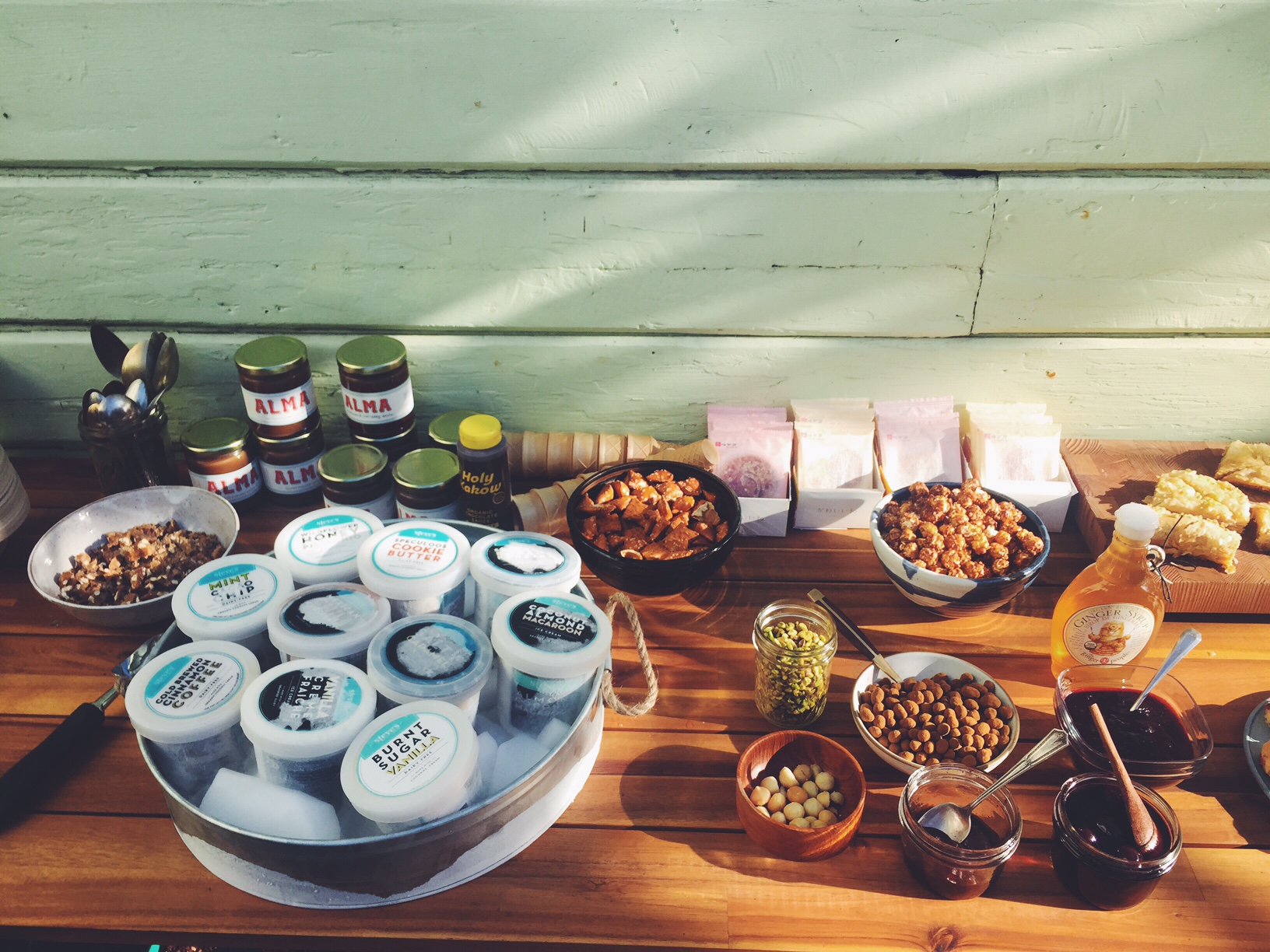 Steve’s Ice Cream out of Brooklyn sent over 10 flavors for us to sample, including 5 really yummy dairy free ones. I am a sucker for a good vegan ice cream, as I need to go easy on the dairy, (it’s a love hate relationship…) so I was happy to discover how good they tasted. The honey pistachio especially…Friends brought over fun toppings, fancy Pinkerton Caramel Corn, Alma Chocolate salted caramel sauce which I literally want to spoon into my mouth, or just eat the entire jar…