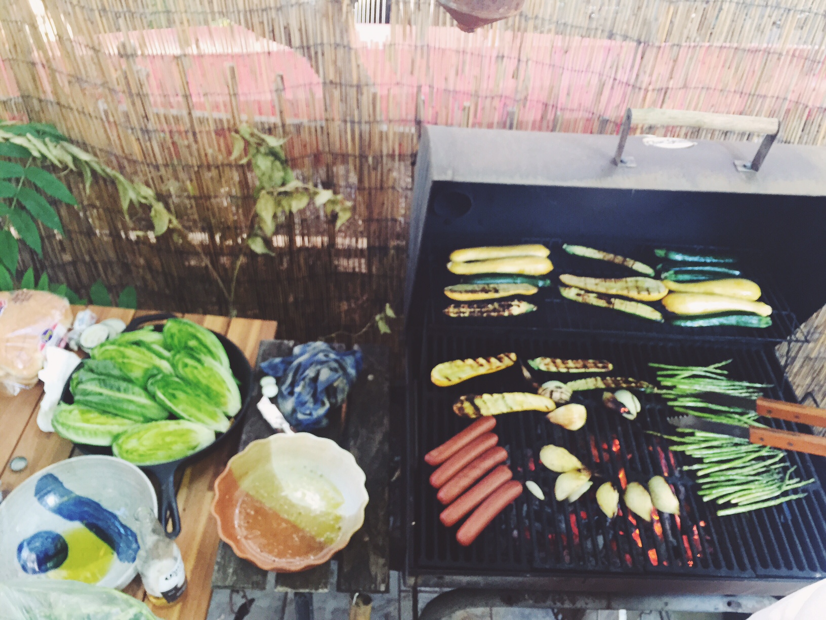 Adam manned the grill and piled it high with asparagus, fancy hotdogs, onions, zucchini from a friends yard and romaine hearts.
