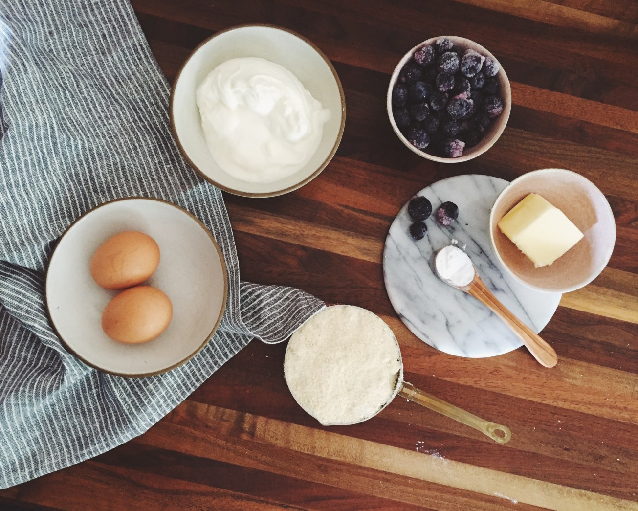 Place the almond meal, flour, baking powder, and salt into the mixer, and stir on low. Add the honey, yogurt, and eggs. Mix on low. Add the butter to combine.